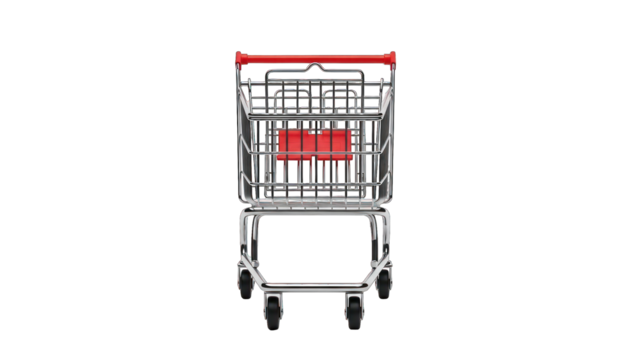 Straight-on shot of a shopping cart, red accents, metallic, on a black background