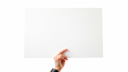 Mano sosteniendo un cartel blanco. Aislada sobre fondo transparente. PNG.