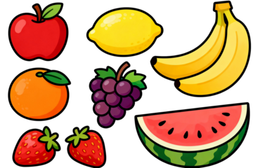 Cute kawaii fruits with faces: lemon, apple, orange, strawberry, pineapple, lime smiling characters