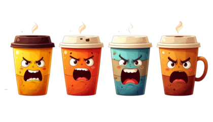 Collection of four cute cartoon coffee cups, isolated on transparent background