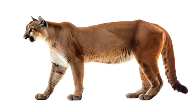puma cat cutout isolated on white, side view on transparent png background