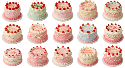 Collection of adorable decorated cakes with icing designs and cherries on top