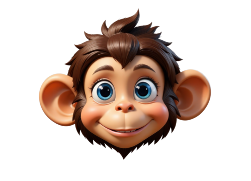 Cartoon monkey face with big blue eyes and smile, transparent background