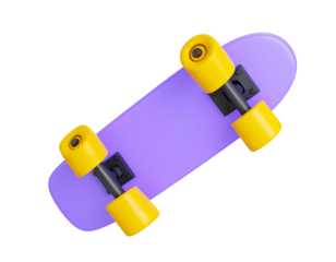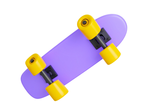 Angled 3D Render of Purple and Yellow Cartoon Skateboard, Dynamic Perspective, Black Background
