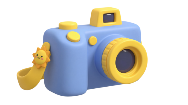Cute 3d rendered cartoon camera toy in blue and yellow with sun charm on transparent background