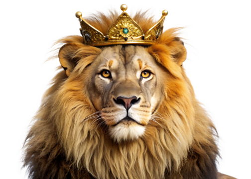 a majestic lion wearing a royal crown isolated on white background PNG , AI GENERATED