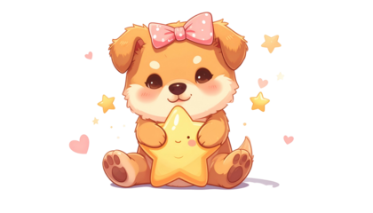 Adorable cartoon puppy with pink bow holding a smiling star, surrounded by hearts and stars