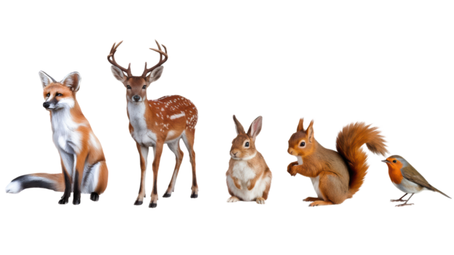 Flat cartoon Illustration of Woodland Forest Animals, cute Deer, Rabbit, Fox, Robin Bird, Fox Club, Squirrel.Badger. Vector clipart of wildlife for children book.   Transparency PNG,