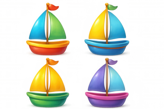 Four colorful toy sailboats with bright sails are sailing on a transparent background, perfect for kids' projects