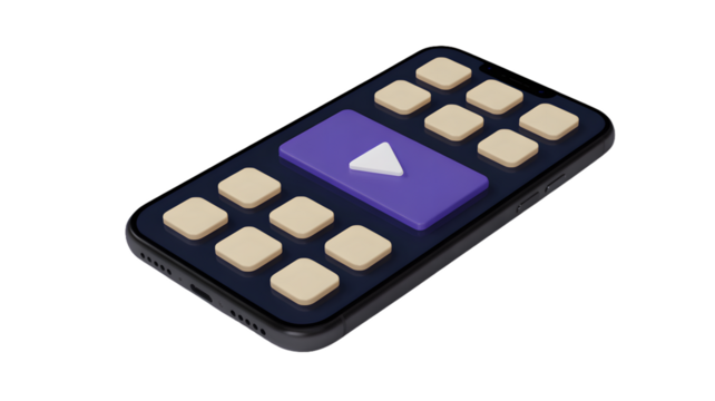 Isometric smartphone with video player and app icons on a black background in cartoon style