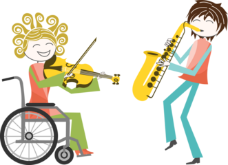 Illustration of a woman in a wheelchair playing a violin duet with a man standing with a saxophone, smiling, on a transparent background in PNG format
