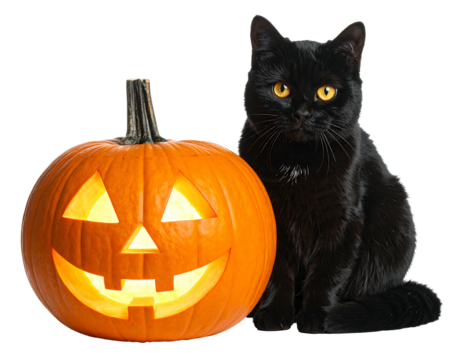 A carved pumpkin with a glowing face and a shiny-coated black cat posing next to it against a transparent background