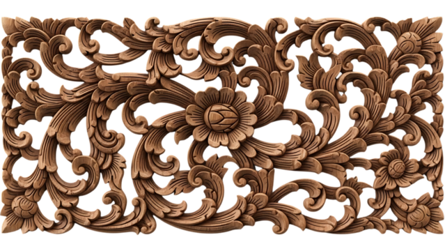 Ornate wood carving detail with swirling leaf pattern, golden brown color, isolated on transparency background, elegant decorative element for classic interior design or furniture accent