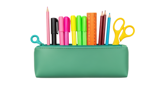 Isolated pencil case filled with school supplies for writing and drawing, stationery set
