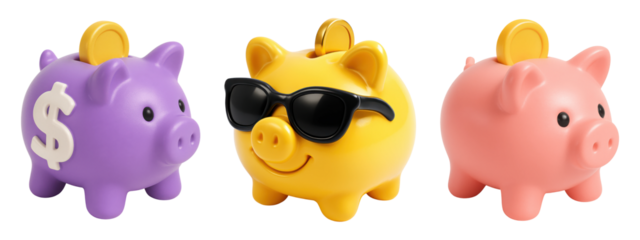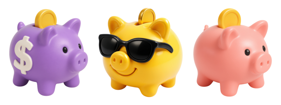 Colorful 3D piggy banks with coins, dollar symbol, and sunglasses