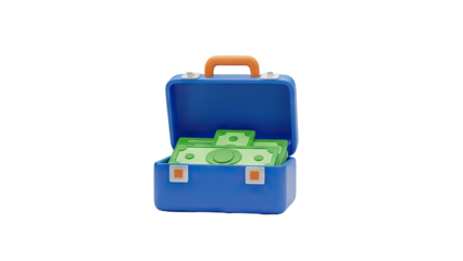 3D Blue briefcase full of cash money on transparent background