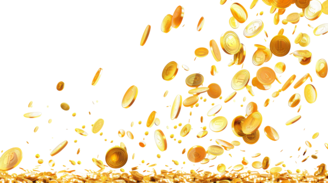 Gold coins fall from the sky, money explosion, earning , money rain, on white background