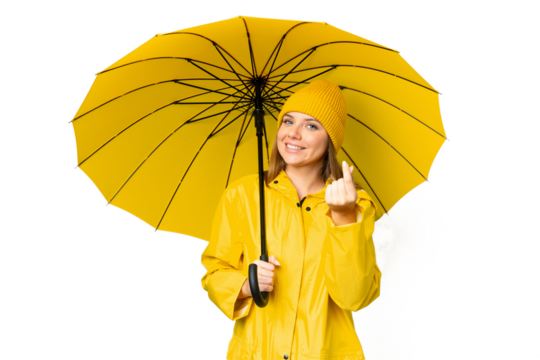 Young caucasian woman with rainproof coat and umbrella over isolated chroma key background making money gesture