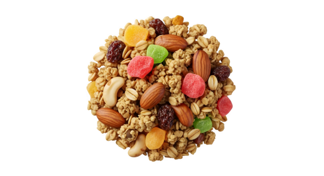 Overhead shot of a granola mix with nuts, dried fruit and colorful candied pieces   ai generative, transparent background, white background.