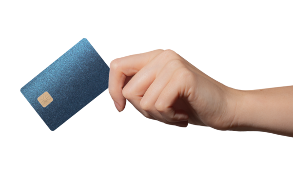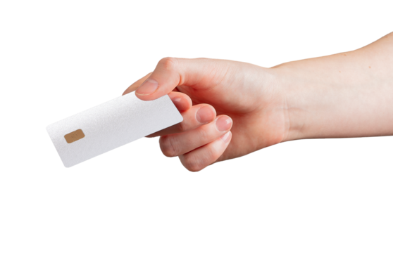 Cutout image of a hand holding a blank white credit card. Transparent image.