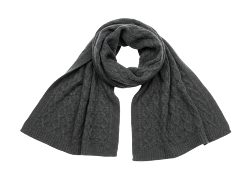 Isolated gray cable knit scarf fashion apparel, folded, accessorized, stylish, cashmere