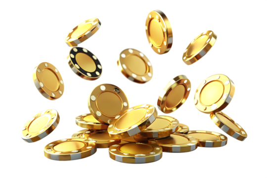Black and gold casino chips falling from above on transparent background