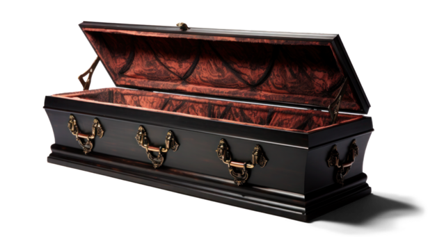 open black coffin, png file of isolated cutout object with shadow on transparent background.