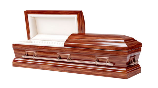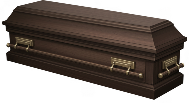Isolated rosewood casket with gold handles, elegant wood grain surface, a symbol of eternal rest