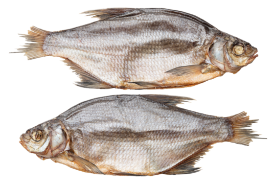 Fish. Dried or Dry seafood snack for beer. Salted sun-dried, jerked or smoked fish. Taranka, vobla. Russian or Ukrainian food. Caspian roach fish. Dead fish. High resolution. Isolated background
