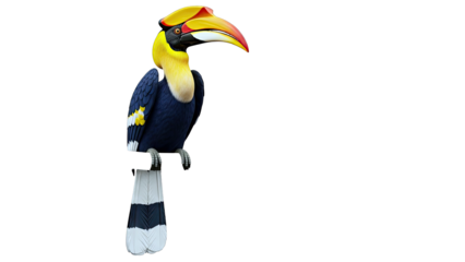 Great Hornbill perched on a white surface against a plain background