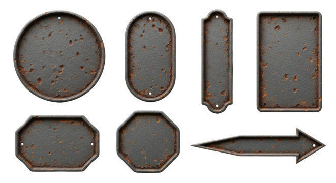 eight severely weathered, antique cast iron signs, dark gray and deep orange rust, blank templates, against a transparent studio background with copy space, showcasing aged industrial asset mockups