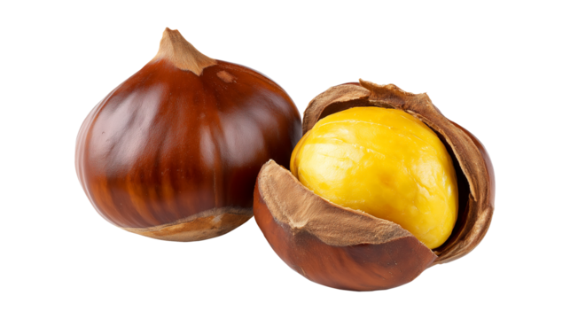 A pair of fresh chestnuts from the fall harvest season isolated on a transparent background