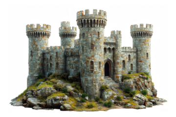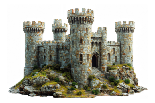 Medieval grey stone castle fortress with turrets isolated for fantasy gaming or history projects.