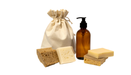 Natural cleaning supplies soaps, bottle, sponge, & fabric bag arranged against black