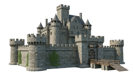 Medieval castle with stone walls and towers, isolated on white background. transparent background