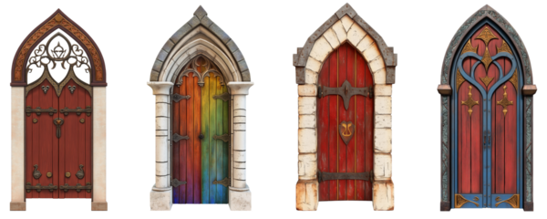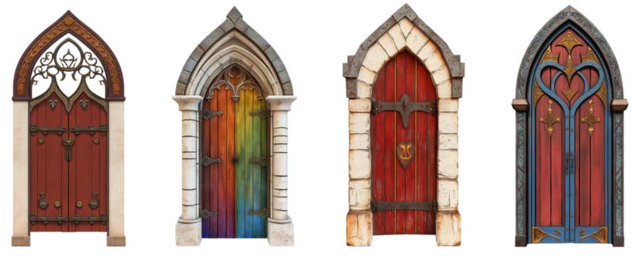 A large arched wooden door with iron studs and a Gothic design, isolated on a transparent background