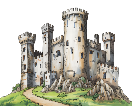 Fantasy castle towers with blue rooftops isolated on transparent PNG image perfect for game environments or medieval scenes