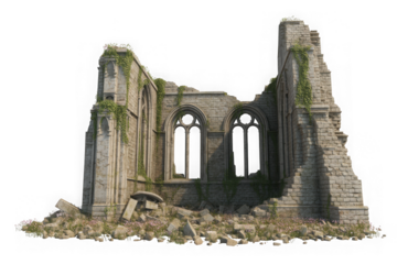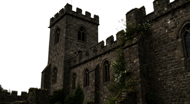 Old stone cathedral wall with ivy on Transparent background