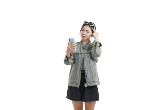 Middle aged asian man is talking on his smartphone with a thoughtful expression on transparent background