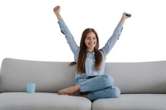 young woman sitting on a sofa, raising her arms in excitement while holding a remote control against transparent background, dressed in casual denim and a blue shirt. Concept of relaxation