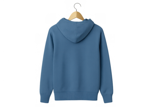 Blue hoodie back view on a hanger, presenting casual apparel for clothing brand mockup and design