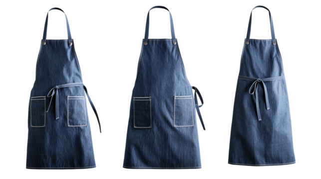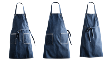 Three Blue Denim Aprons with Varying Pocket Styles on Transparent Background, PNG