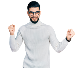 Young arab man with beard wearing elegant turtleneck sweater and glasses dancing happy and cheerful, smiling moving casual and confident listening to music