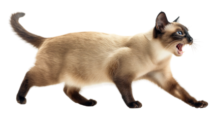 Side view Siamese cat with open mouth isolated on white or transparent background, png clipart, design element. Easy to place on any other background.