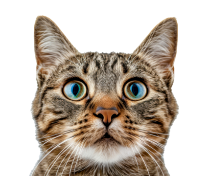 Portrait of a funny surprised cat, closeup, isolated on transparent background, png