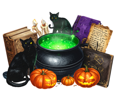 Collection of halloween themed sugar cookies including pumpkins ghosts and a black cat isolated on transparent background