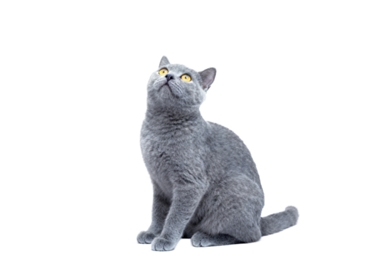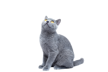 A close-up view of a curious gray cat with striking yellow eyes. gazing upward against a bright white background. conveying a sense of wonder and tranquility. ideal for pet-related content