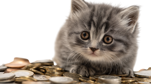 Adorable gray kitten amidst coins