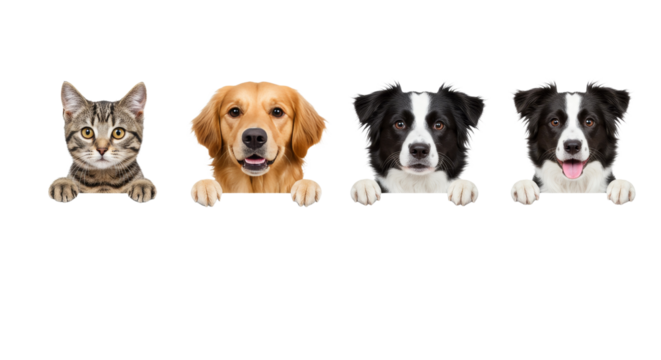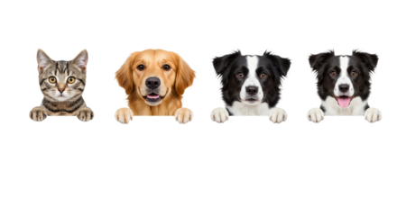 Dogs and cats peeking over web banner extracted on PNG. AI GENERATED.