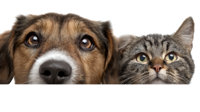 A curious dog and cat peeking together, showcasing their friendship, isolated on a white background.